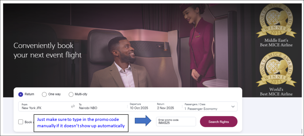 To benefit, use the link below or use the code IMAS25 when searching flight options as indicated below.